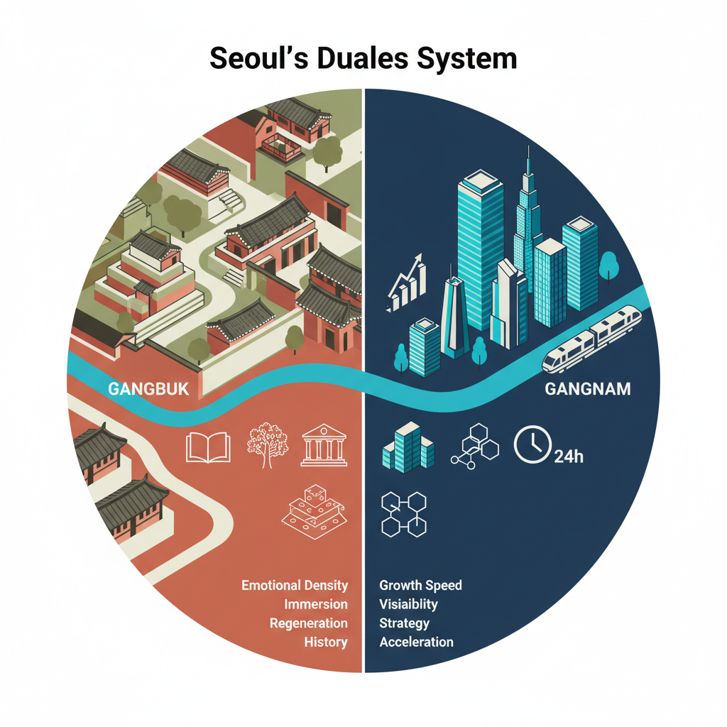 Seoul besteht faktisch aus zwei Städten, getrennt durch den Han-Fluss – und organisiert nach grundlegend unterschiedlichen Logiken.