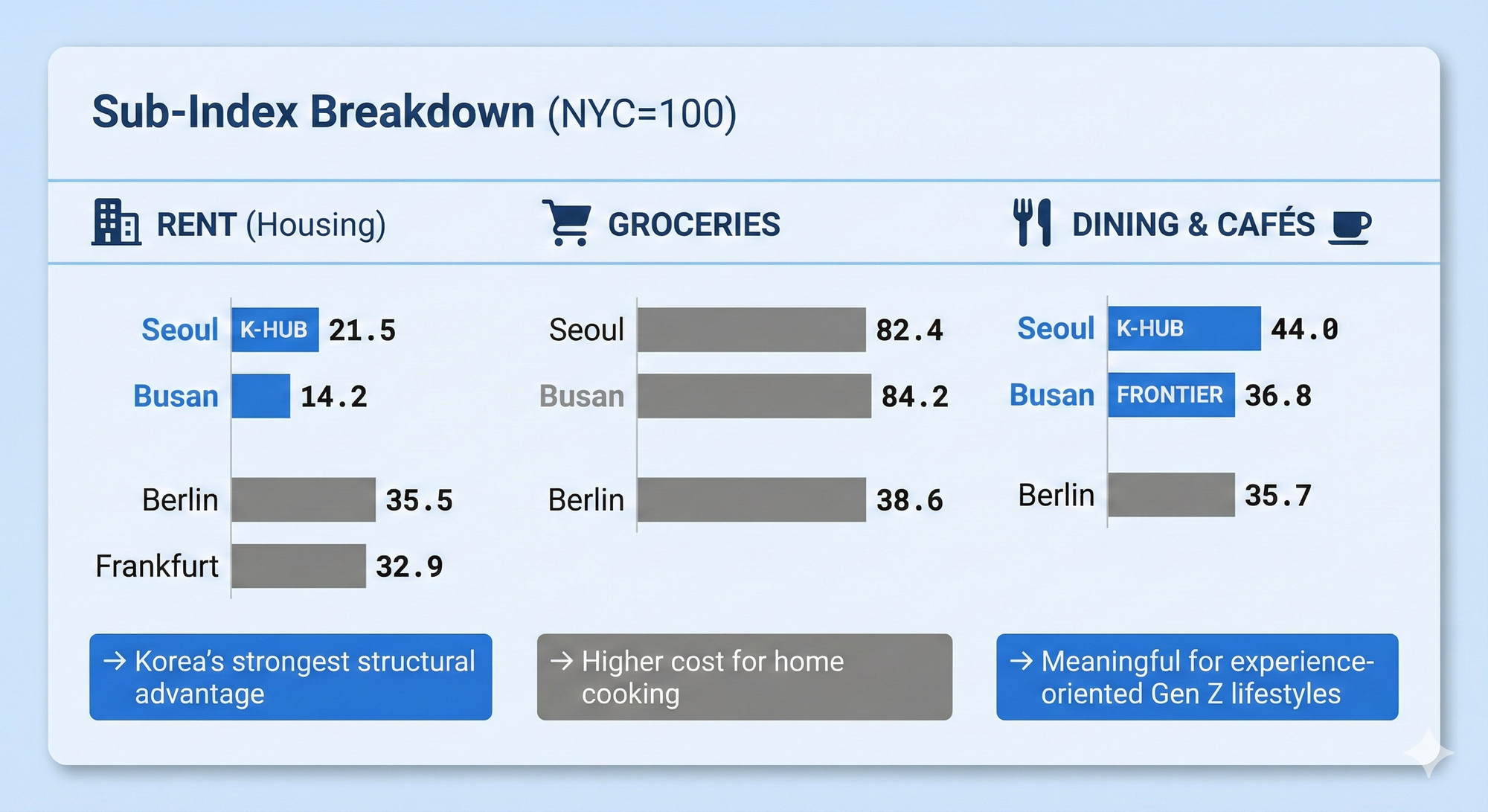 - Implication: Actual living costs are better reflected by the Dining & Cafés index (Seoul 44.0 / Busan 36.8)