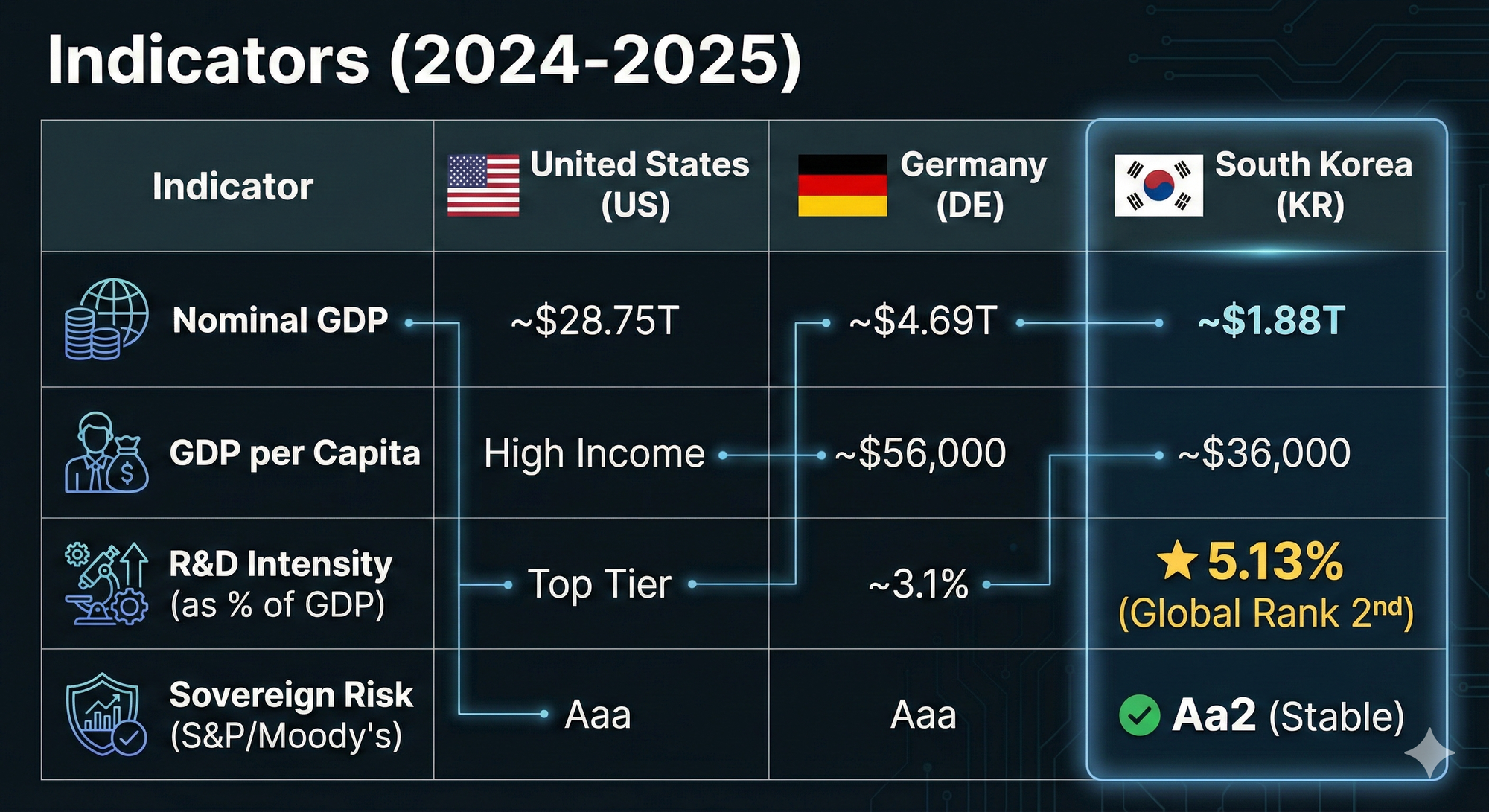 Korea’s structural strength lies in R&D intensity, not sheer scale.