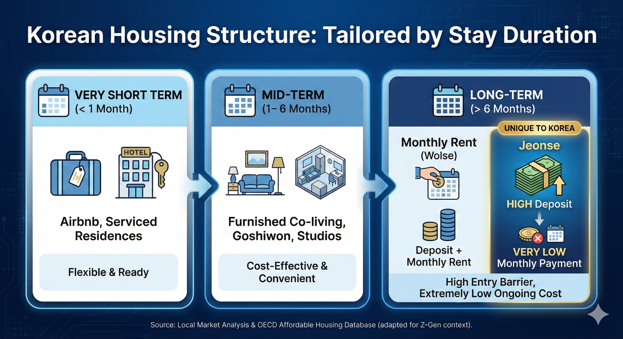 Housing is the largest component of living costs, and Korea offers highly segmented options by length of stay.
