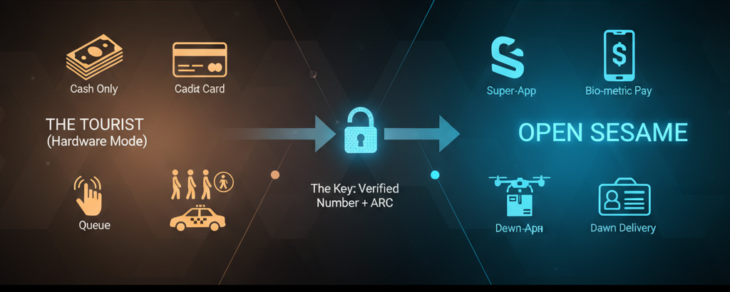 - The Resident Zone (Top-Right): Bio-metric payments, app-based hailing, and dawn delivery. This is "Software Mode"—the borderless, sci-fi experience you came for.