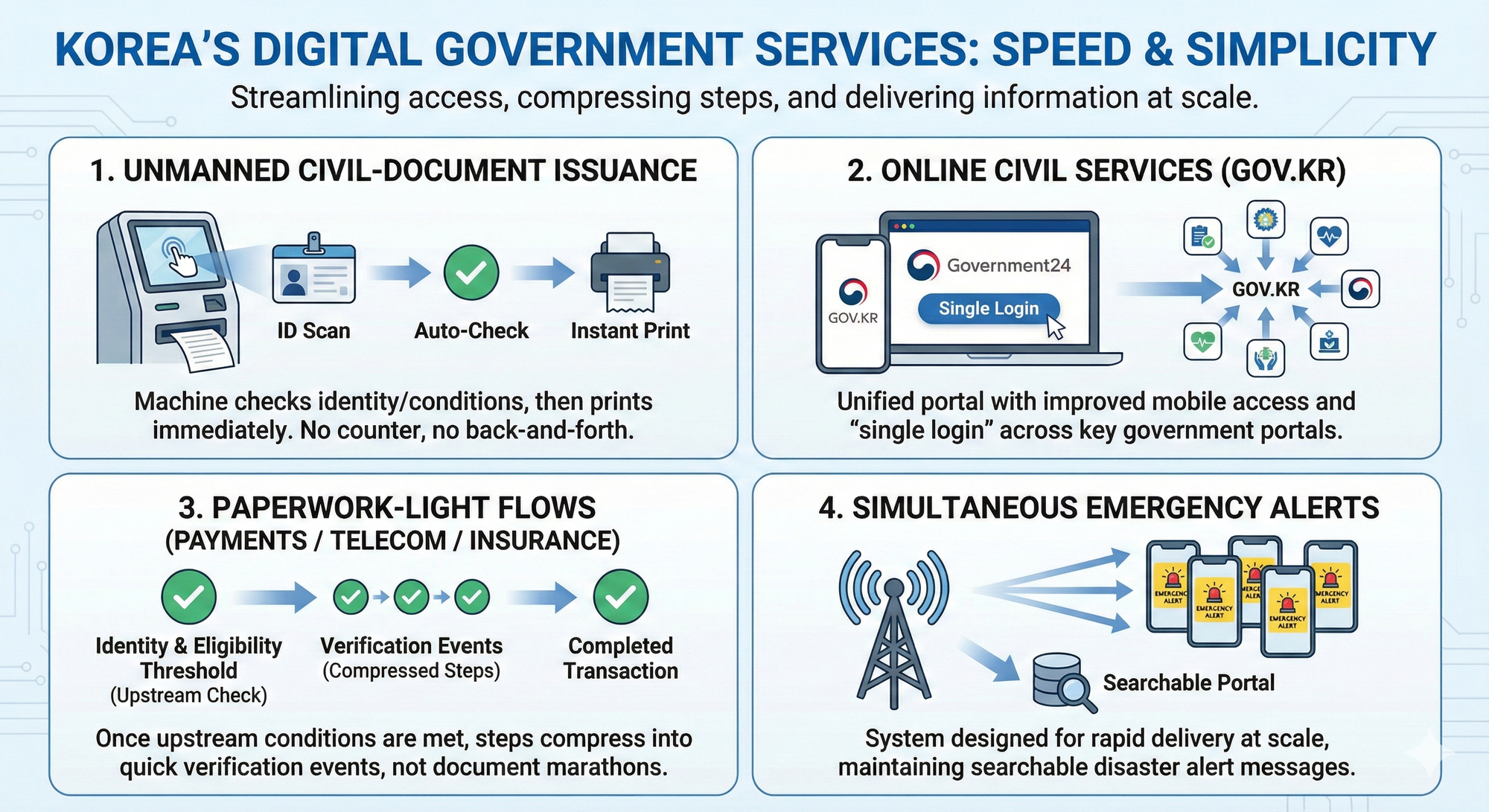Korea’s speed often comes from a structural move: not approving faster, but reducing how often approval is required—primarily by removing repetitive proof and the time-cost of re-verifying the same facts across institutions and transactions.
