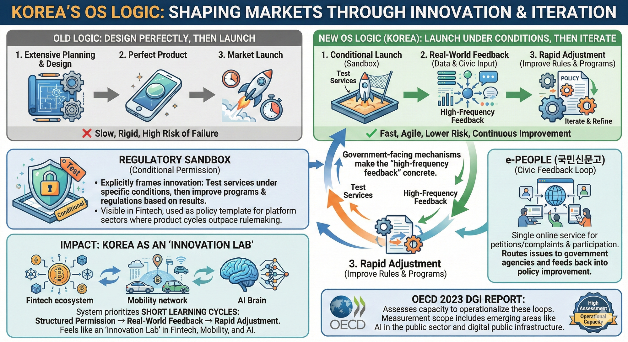 This is why Korea can feel like an “innovation lab” in areas such as fintech, mobility, and increasingly AI: the system prioritizes short learning cycles—structured permission, real-world feedback, rapid adjustment. The OECD’s 2023 DGI report also notes that the measurement scope includes emerging areas such as AI in the public sector and digital public infrastructure, underscoring how governments are being assessed on their capacity to operationalize these loops.