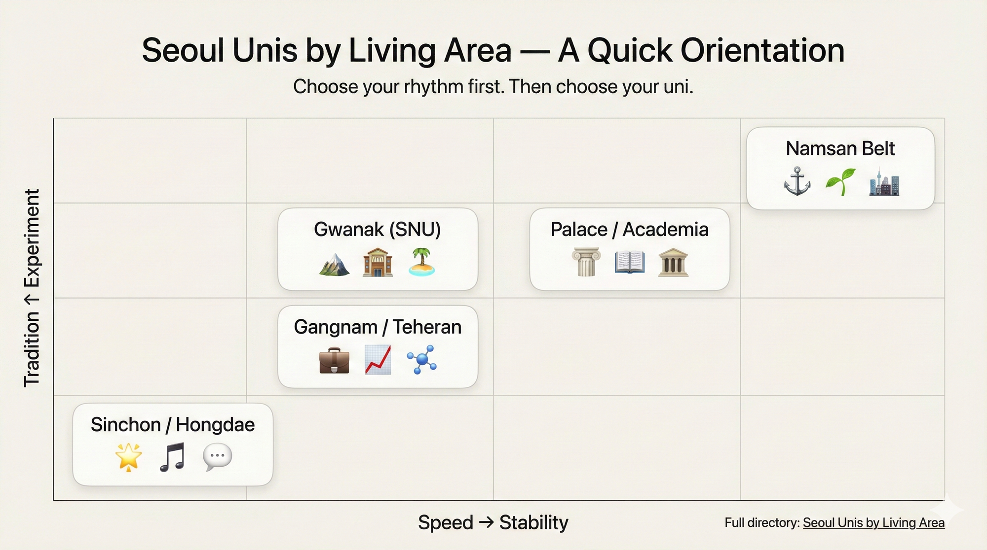 Seoul’s university landscape becomes clearer when you view it as city functions, not league tables. The most useful question is not “Which university is best?” but: Which living area supports my goal—and my daily rhythm?