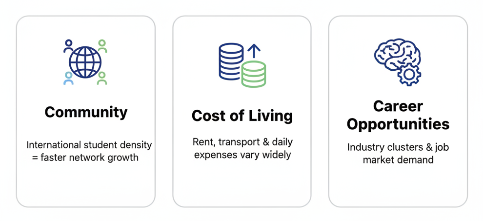 Vol.3 focuses on regional university cities where three conditions align: (1) an international-student community that speeds up settlement, (2) daily “field routes” into nearby industry and research clusters, and (3) a visible Goethe coordinate inside the university-city ecosystem—not as a promise of programs, but as a cultural marker that makes a new city feel more navigable.